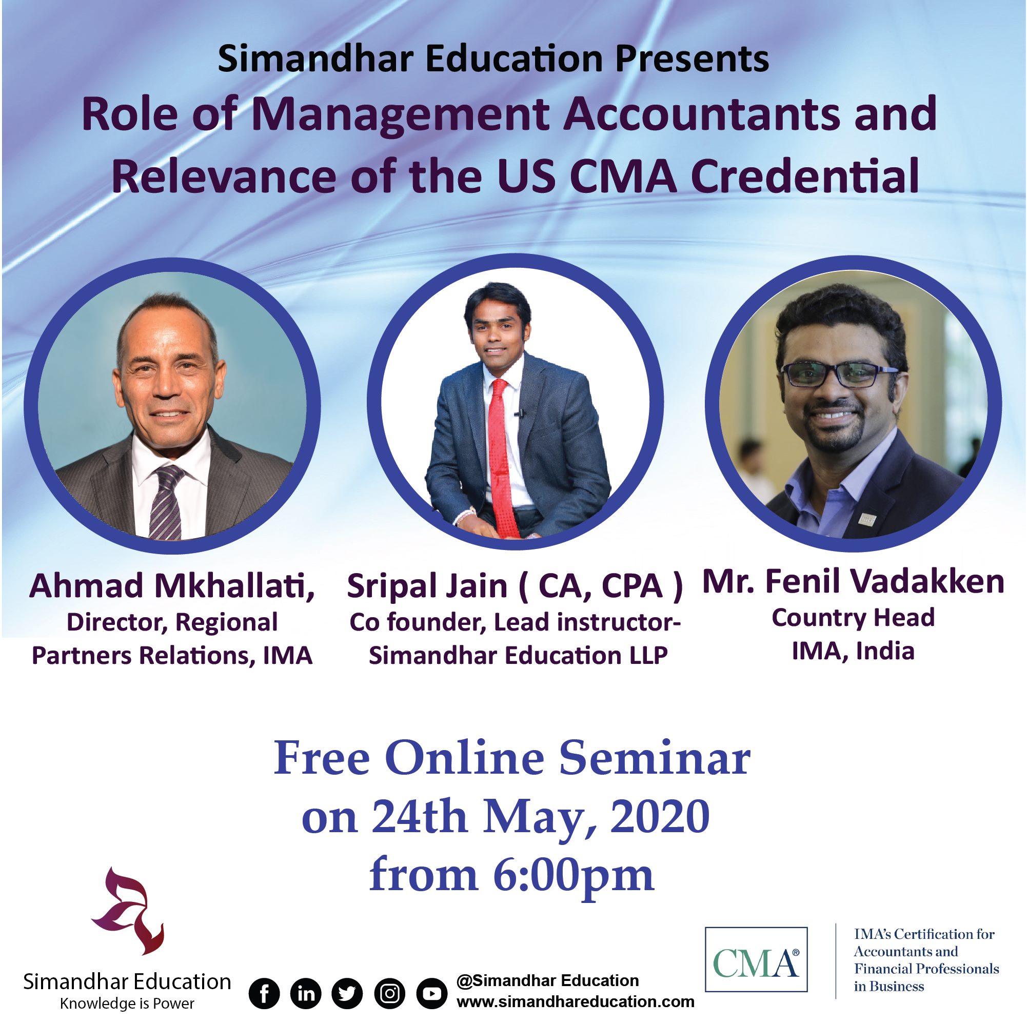Catch us live with Mr. Ahmad Mkhallati (Director, Regional Partners Relations, IMA India), Mr. Fenil Vadakken (Country Head, IMA India) and Mr. Sripal Jain (Co-founder, Lead Instructor, Simandhar Education)
